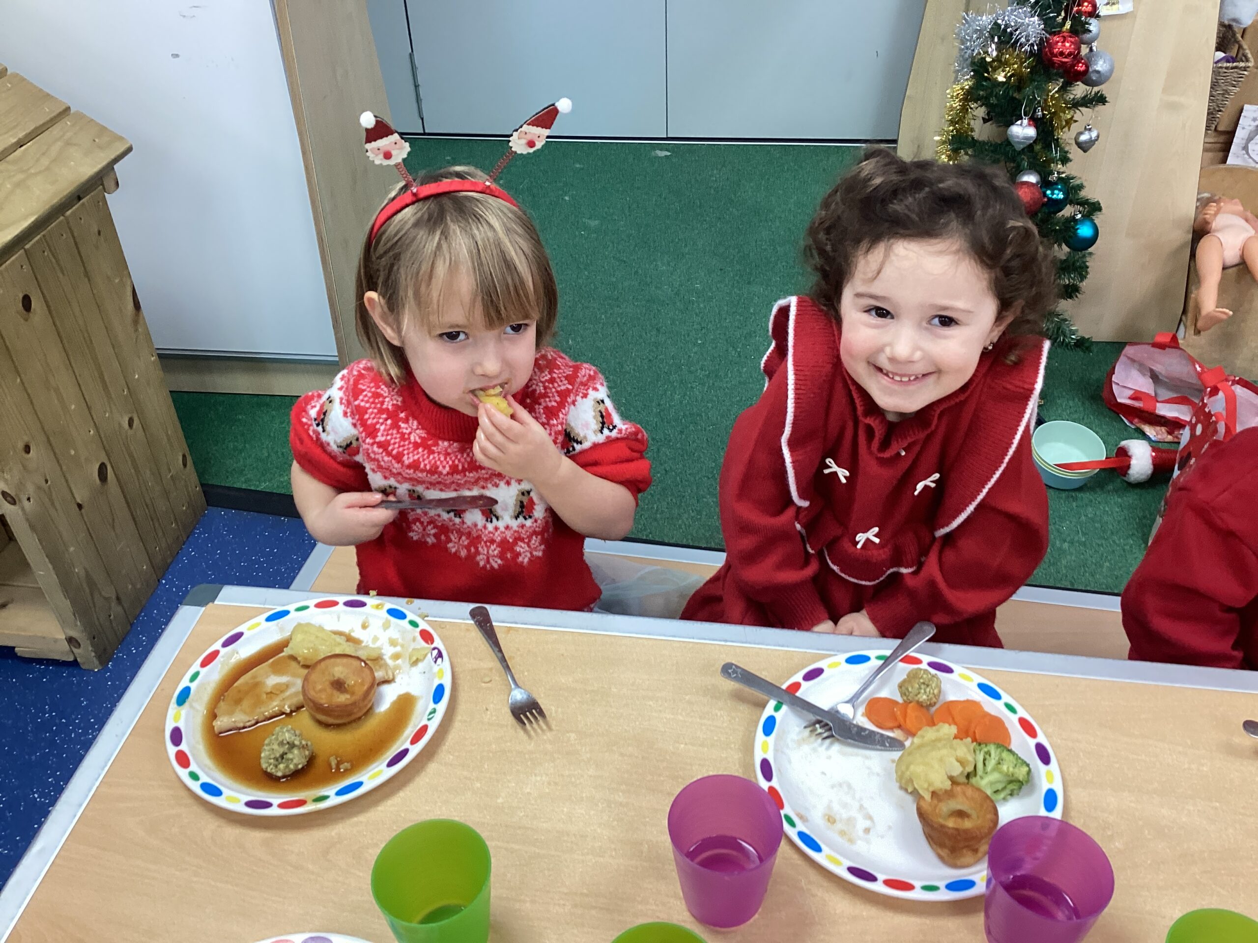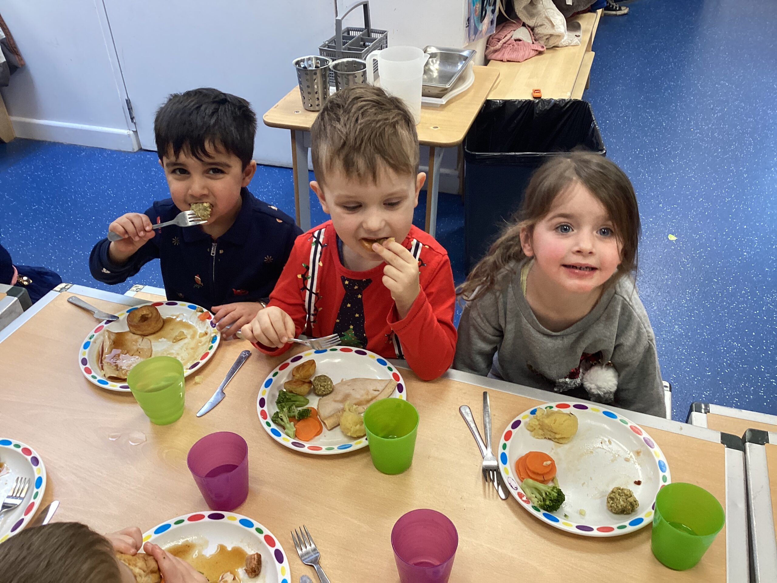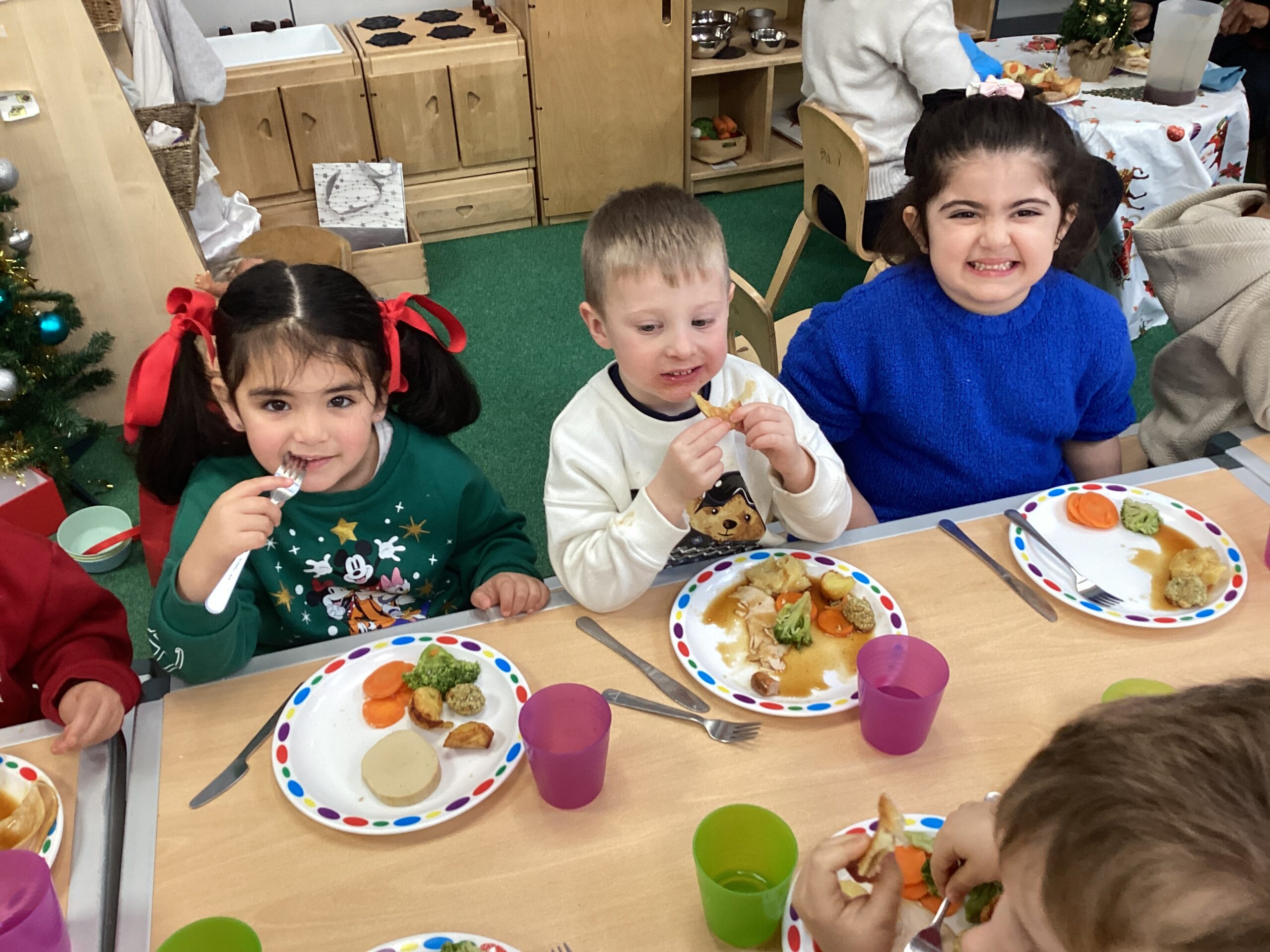 On Tuesday, we enjoyed sitting with our friends and teachers to enjoy a delicious Christmas dinner! We had just finished our Nursery Nativity performance and our special dinner was a lovely way to celebrate how hard we all worked to learn our songs and perform together. Many of us had empty plates and we all had happy faces at the Christmas dinner table!