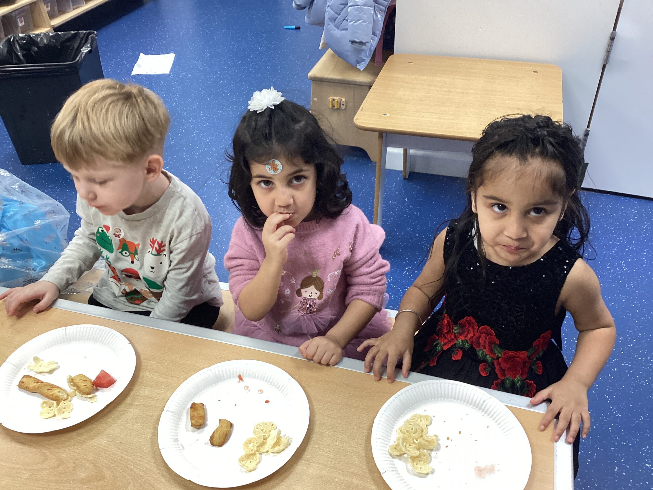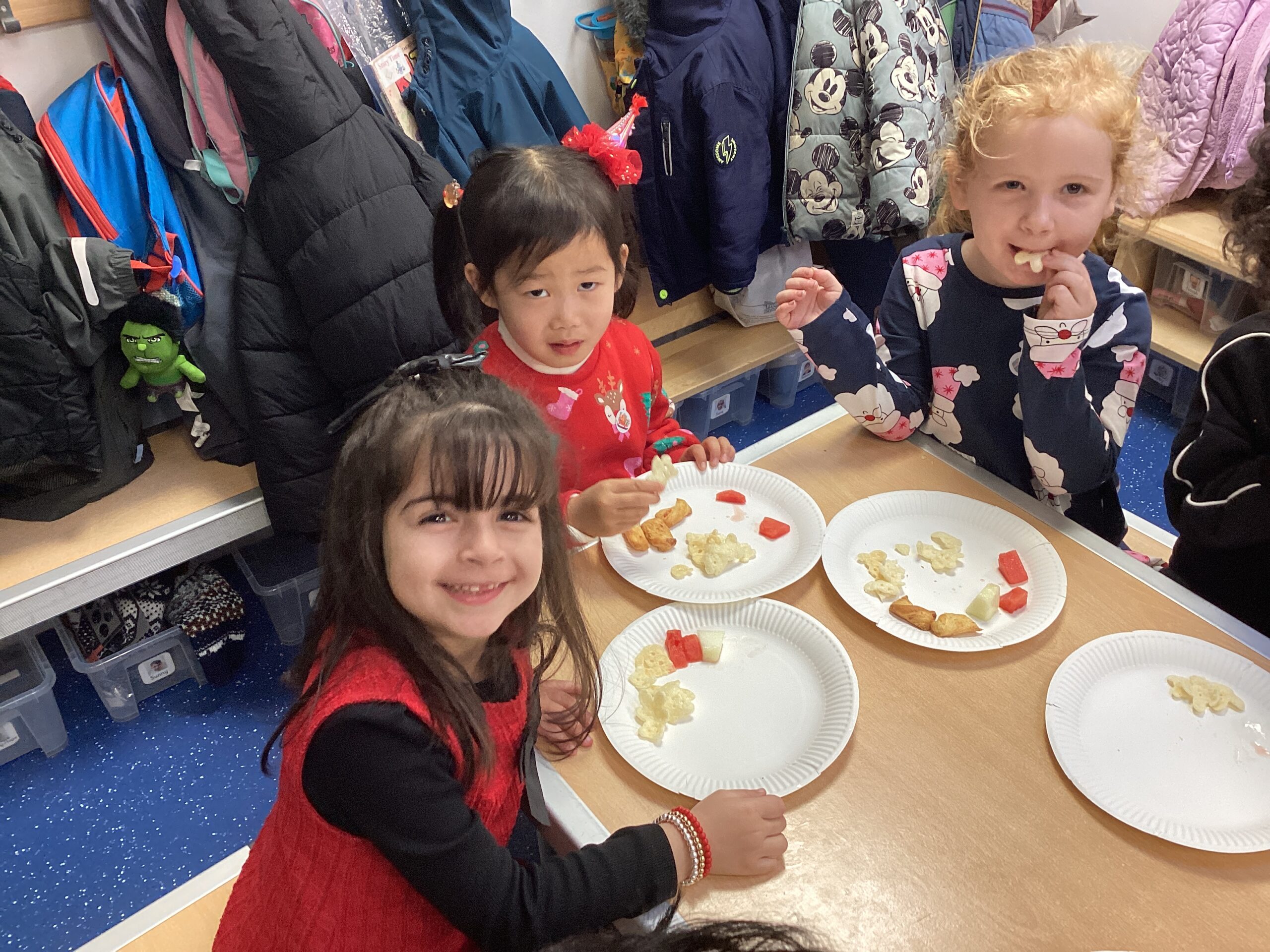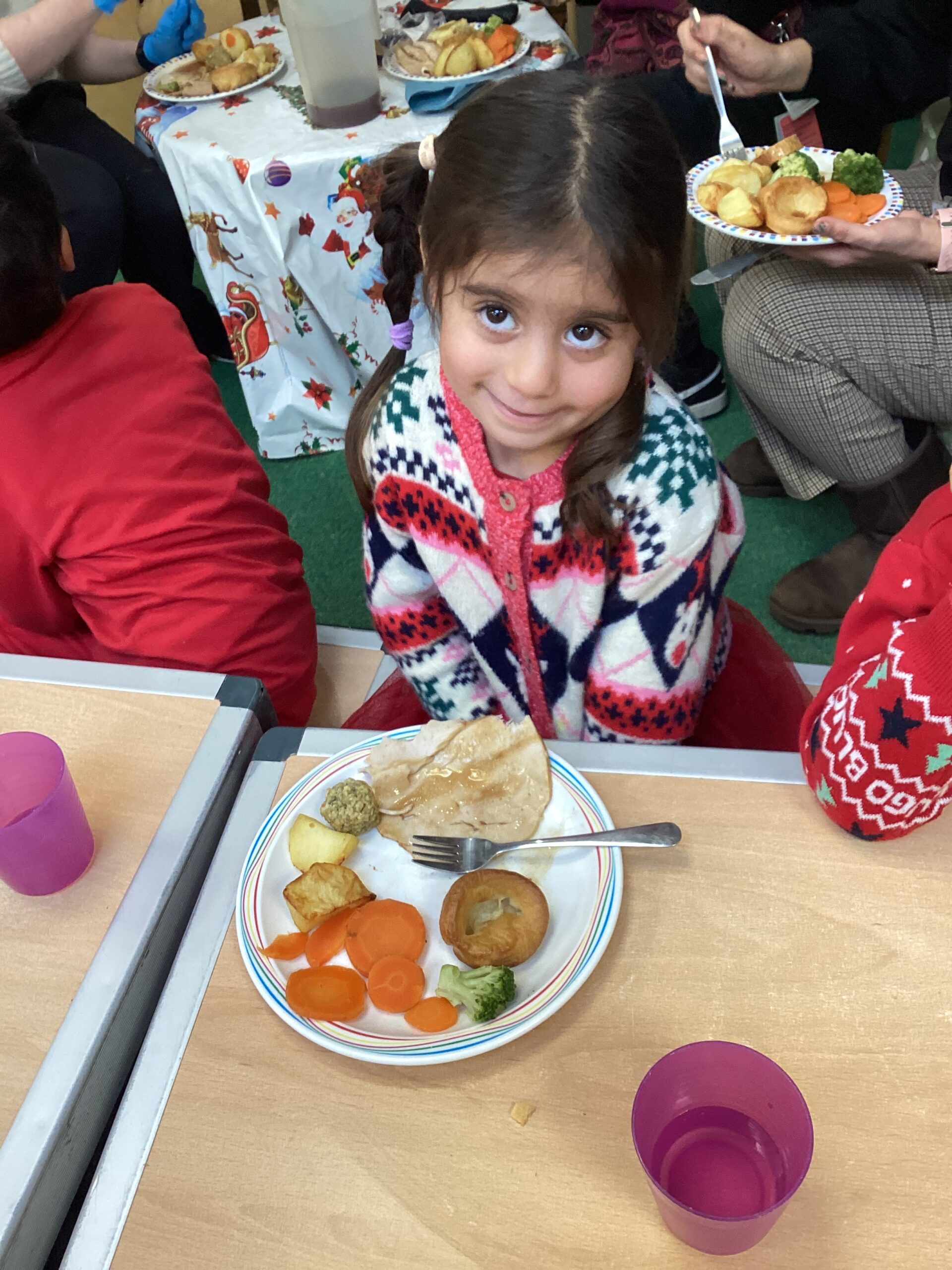 On Tuesday, we enjoyed sitting with our friends and teachers to enjoy a delicious Christmas dinner! We had just finished our Nursery Nativity performance and our special dinner was a lovely way to celebrate how hard we all worked to learn our songs and perform together. Many of us had empty plates and we all had happy faces at the Christmas dinner table!