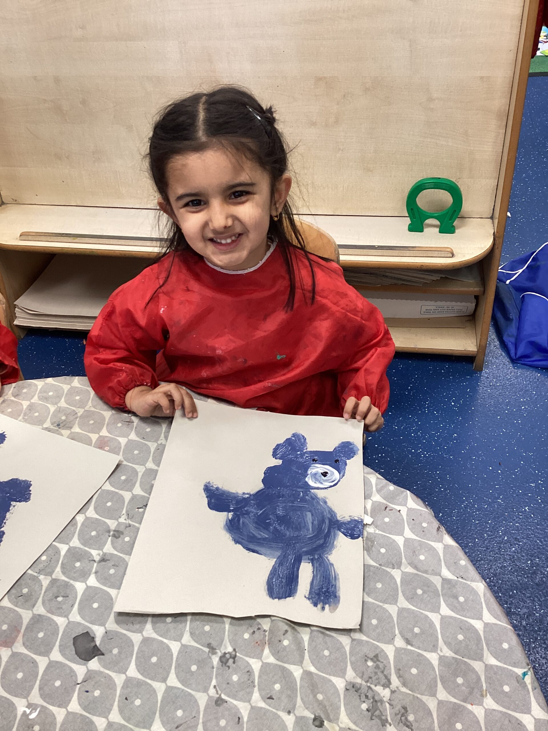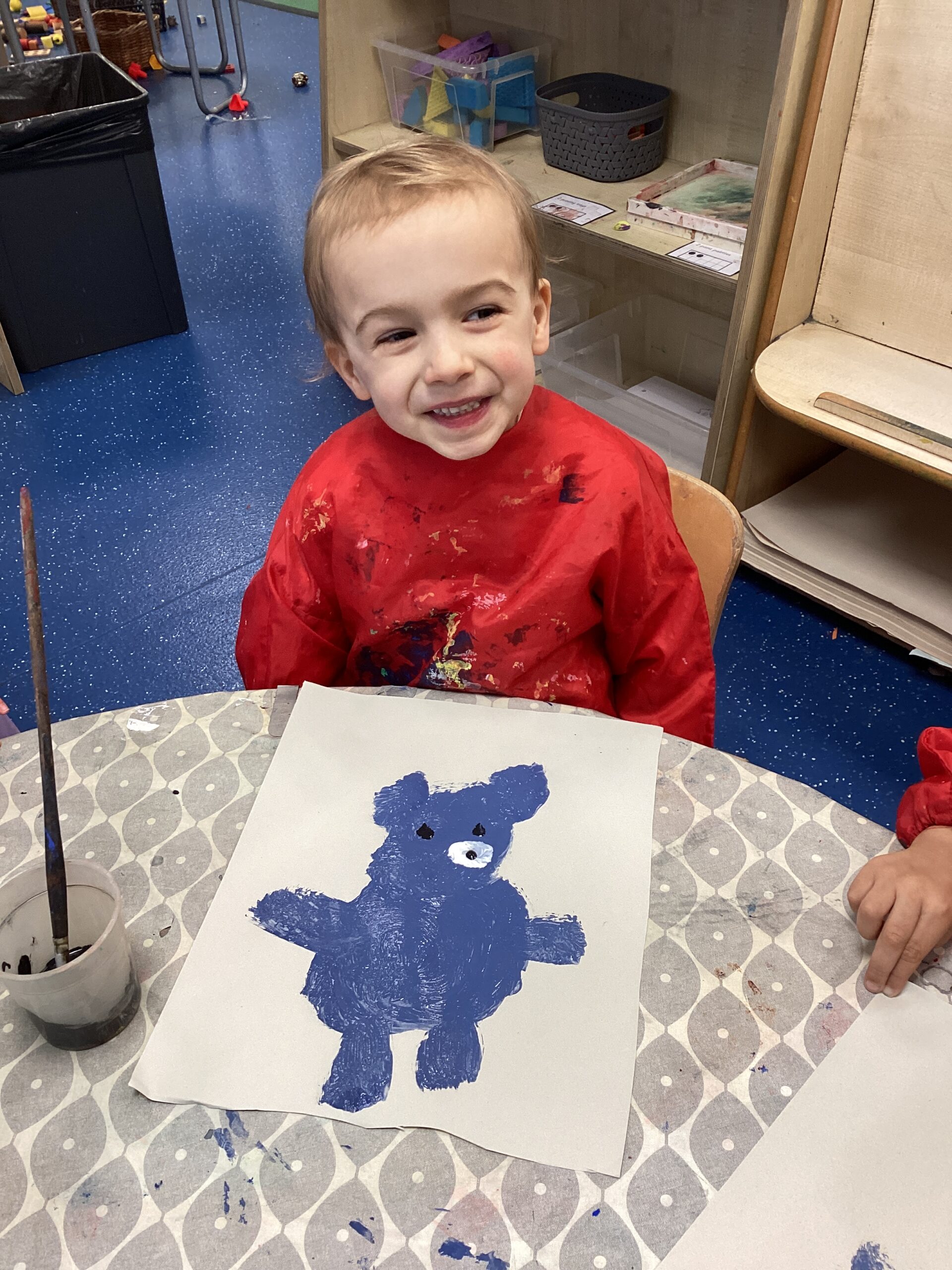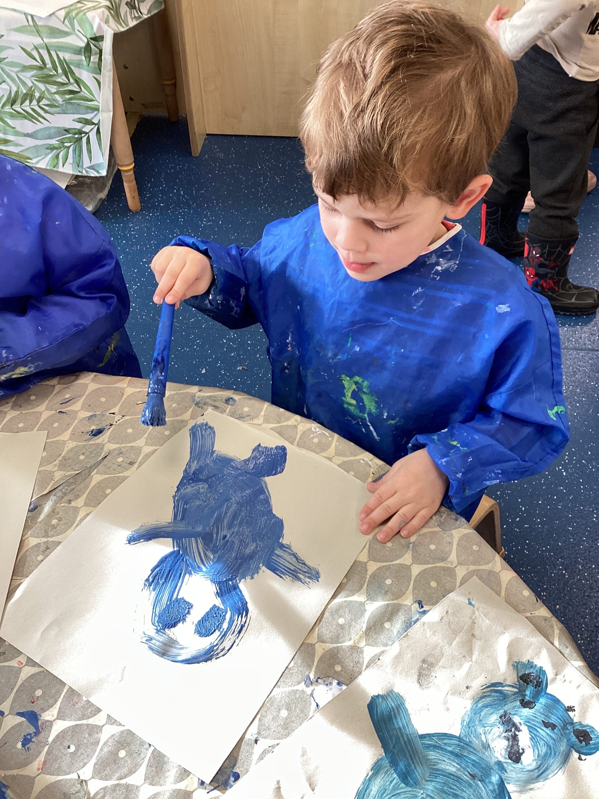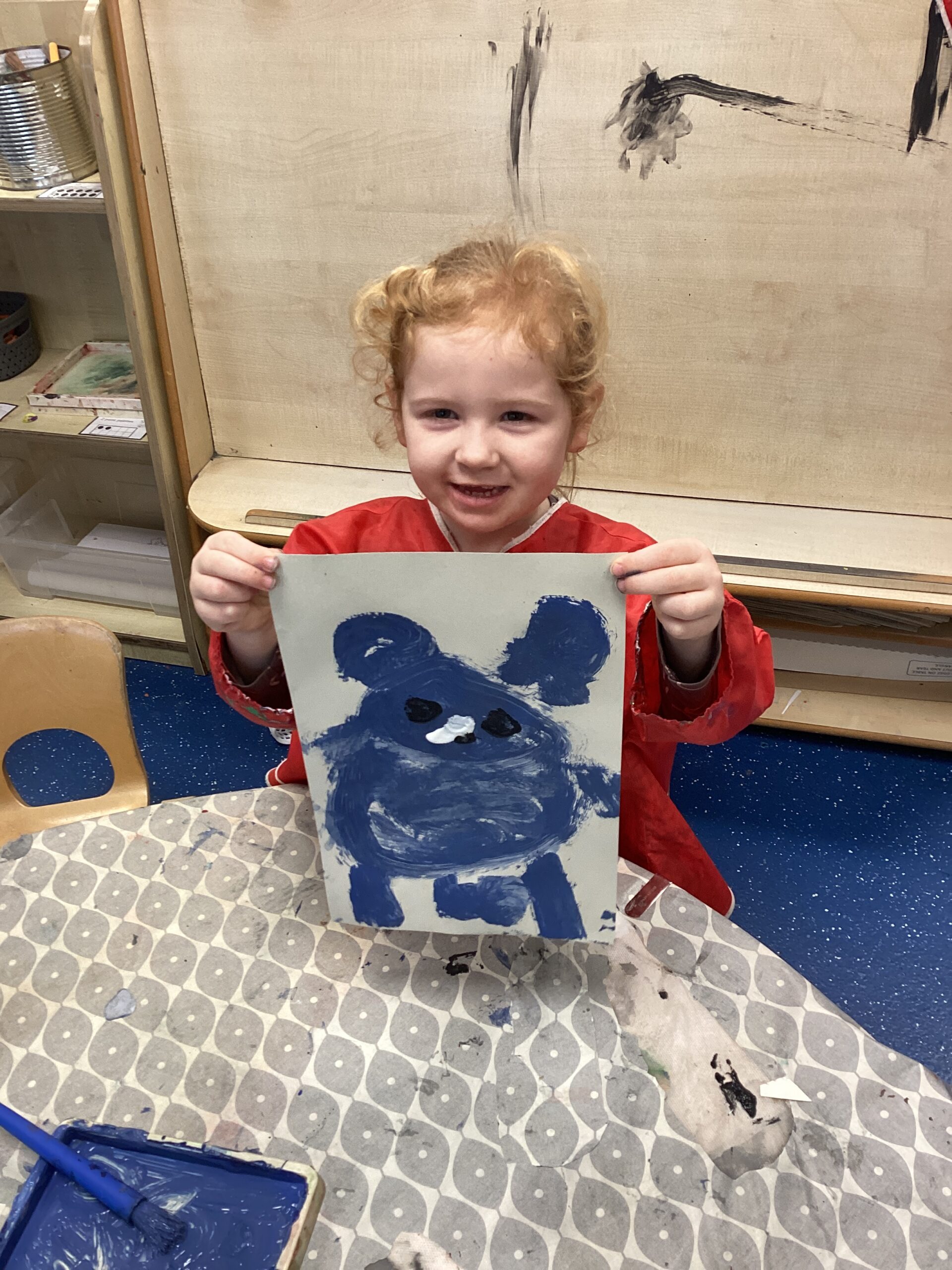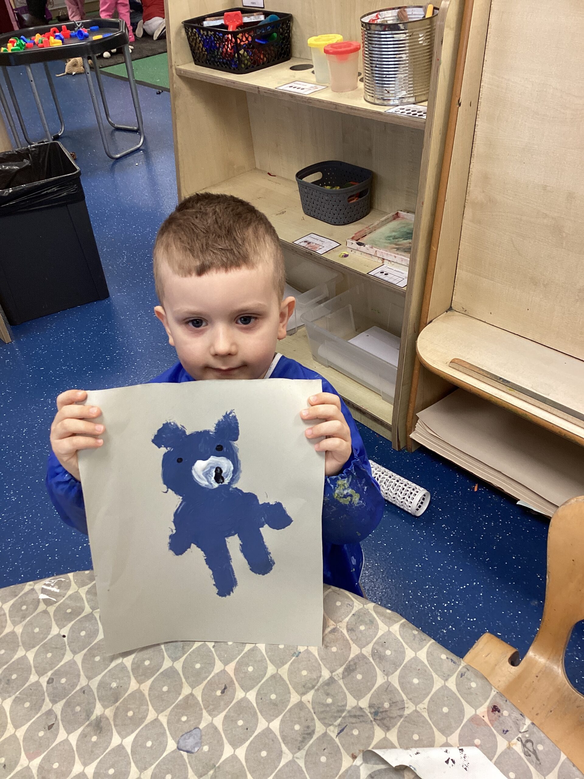 We explored mark-making with paint to create our own Bear pictures. We focused on giving meaning to the marks we make, forming lines and shapes and adding detail. In doing this, we created some wonderful representations of the character, Bear!