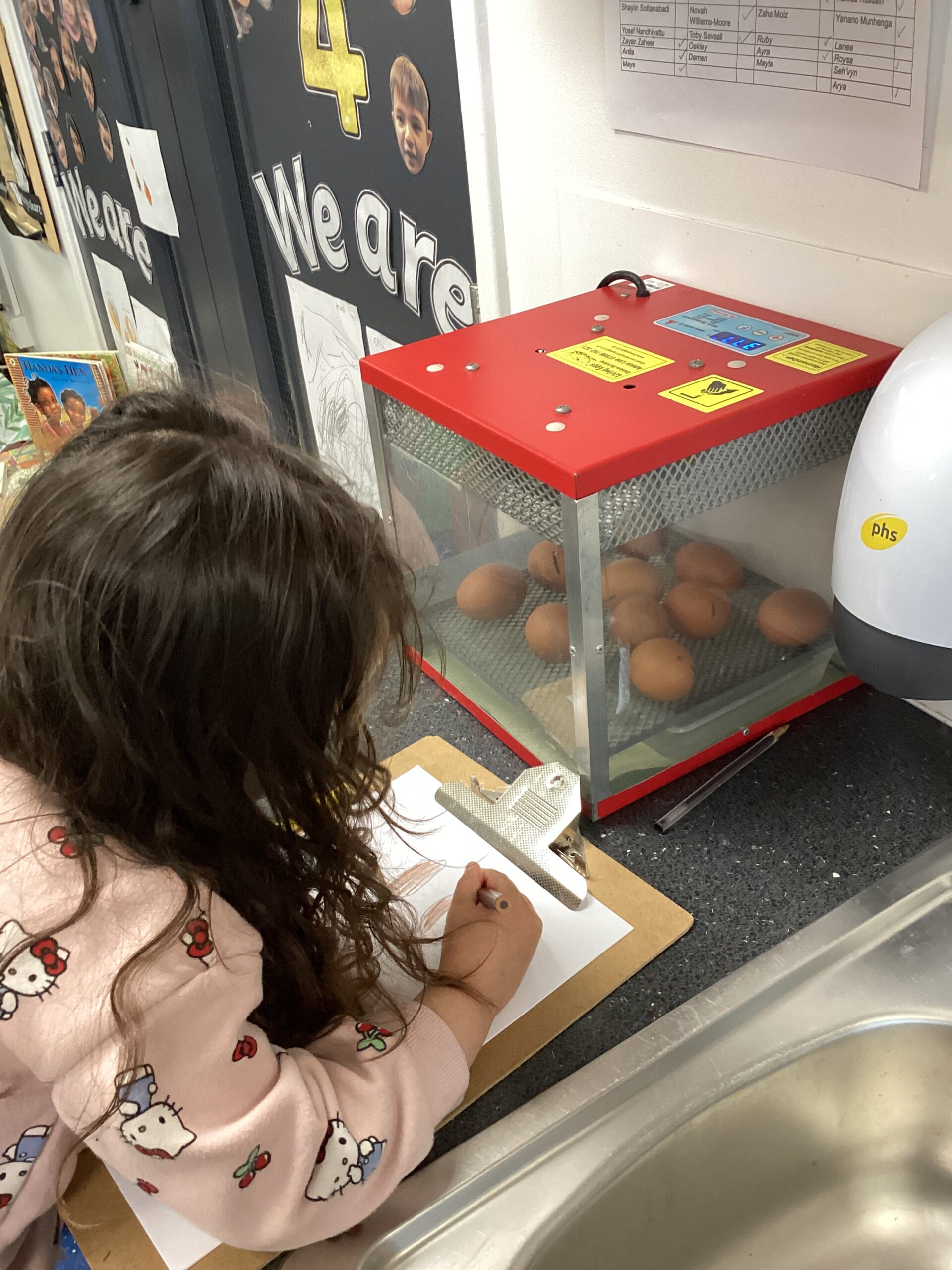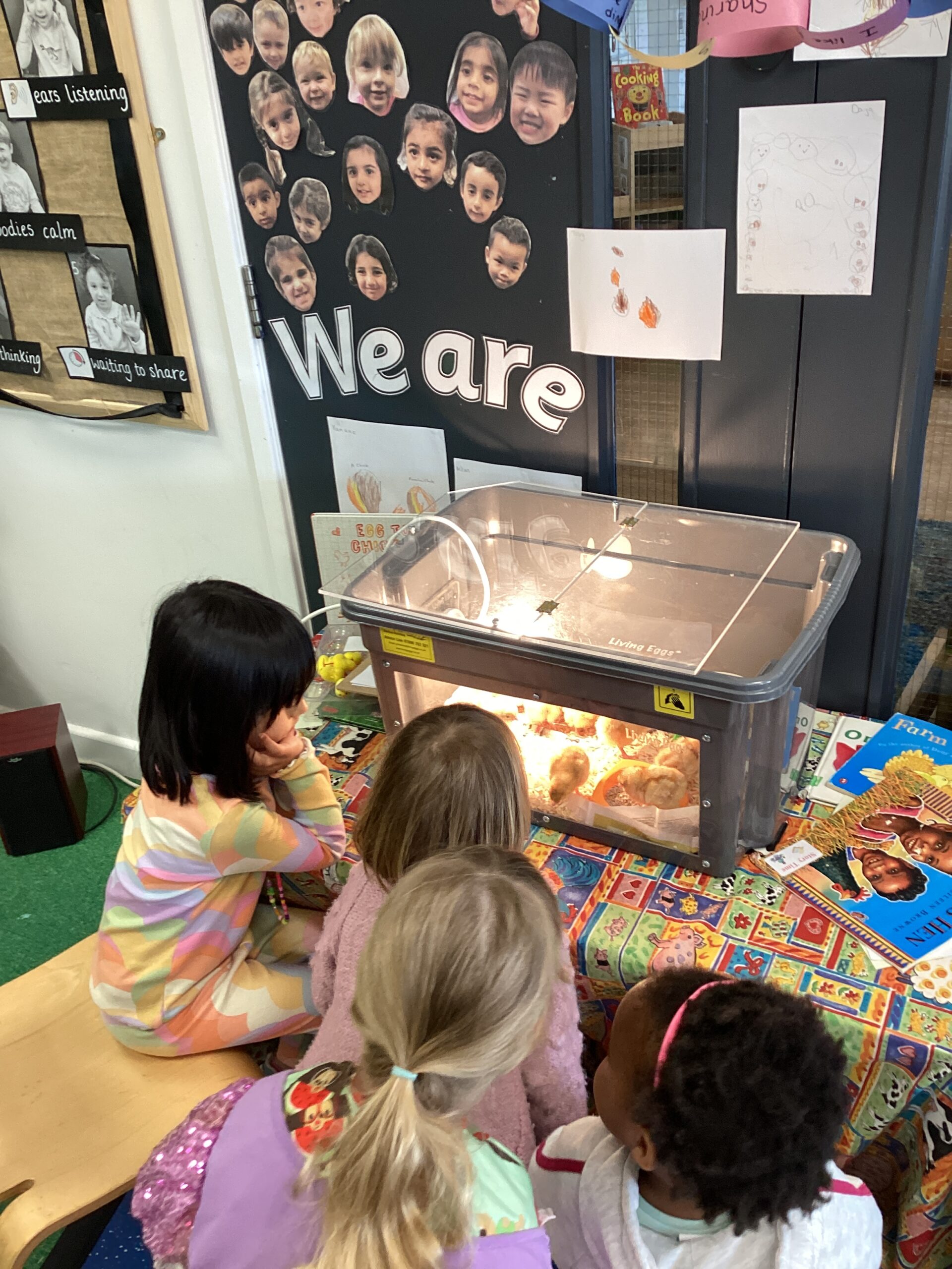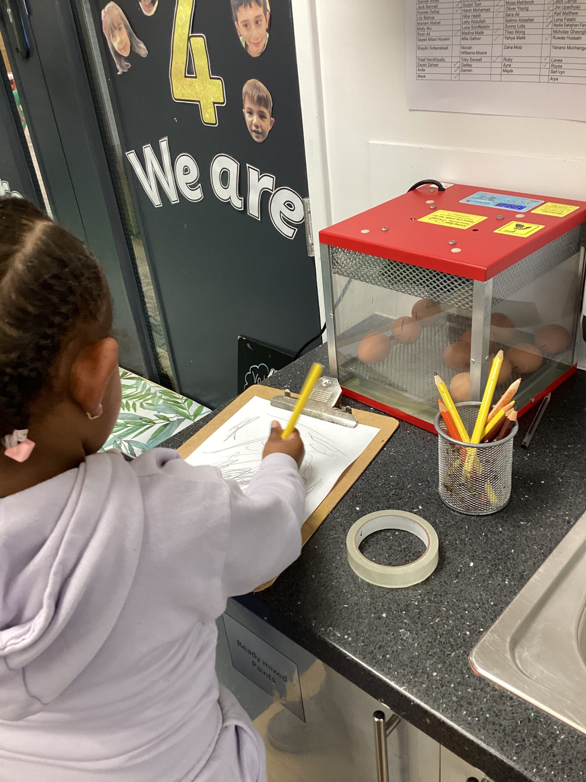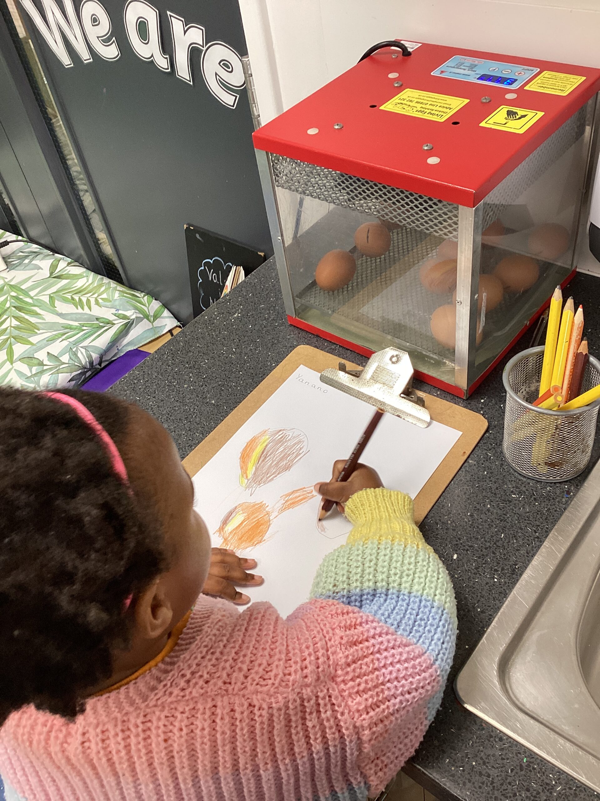 On Monday, we had a very special arrival at Nursery; our 10 eggs which were ready to hatch. We listened carefully to all of the instructions to help us care for them. We set up our eggs in a special incubator. We were told that they would hatch on Wednesday and Thursday, so knew that we would have to wait patiently. We enjoyed watching them closely and some of us had a go at some observational drawing to document the stages of our hatching project.