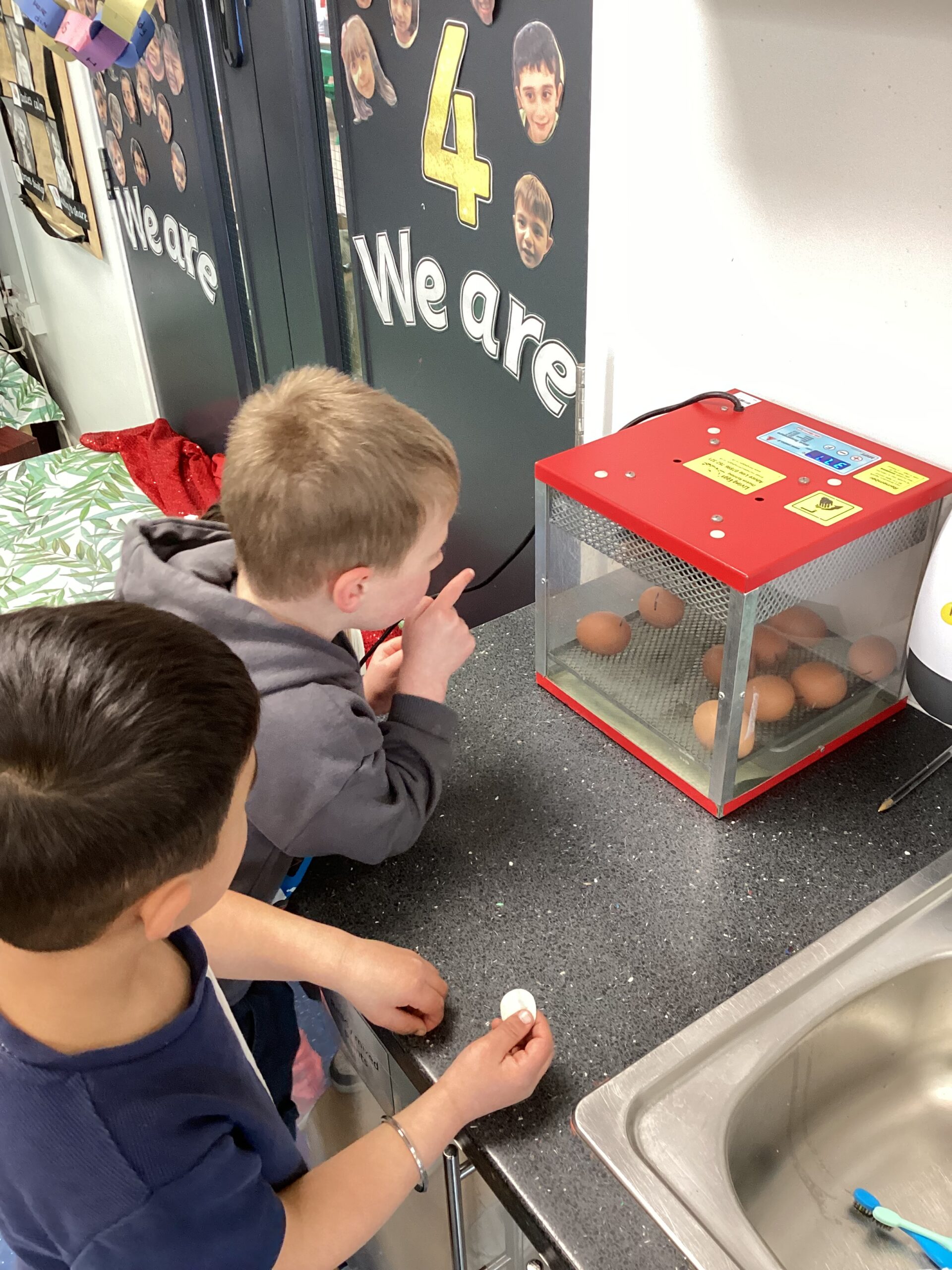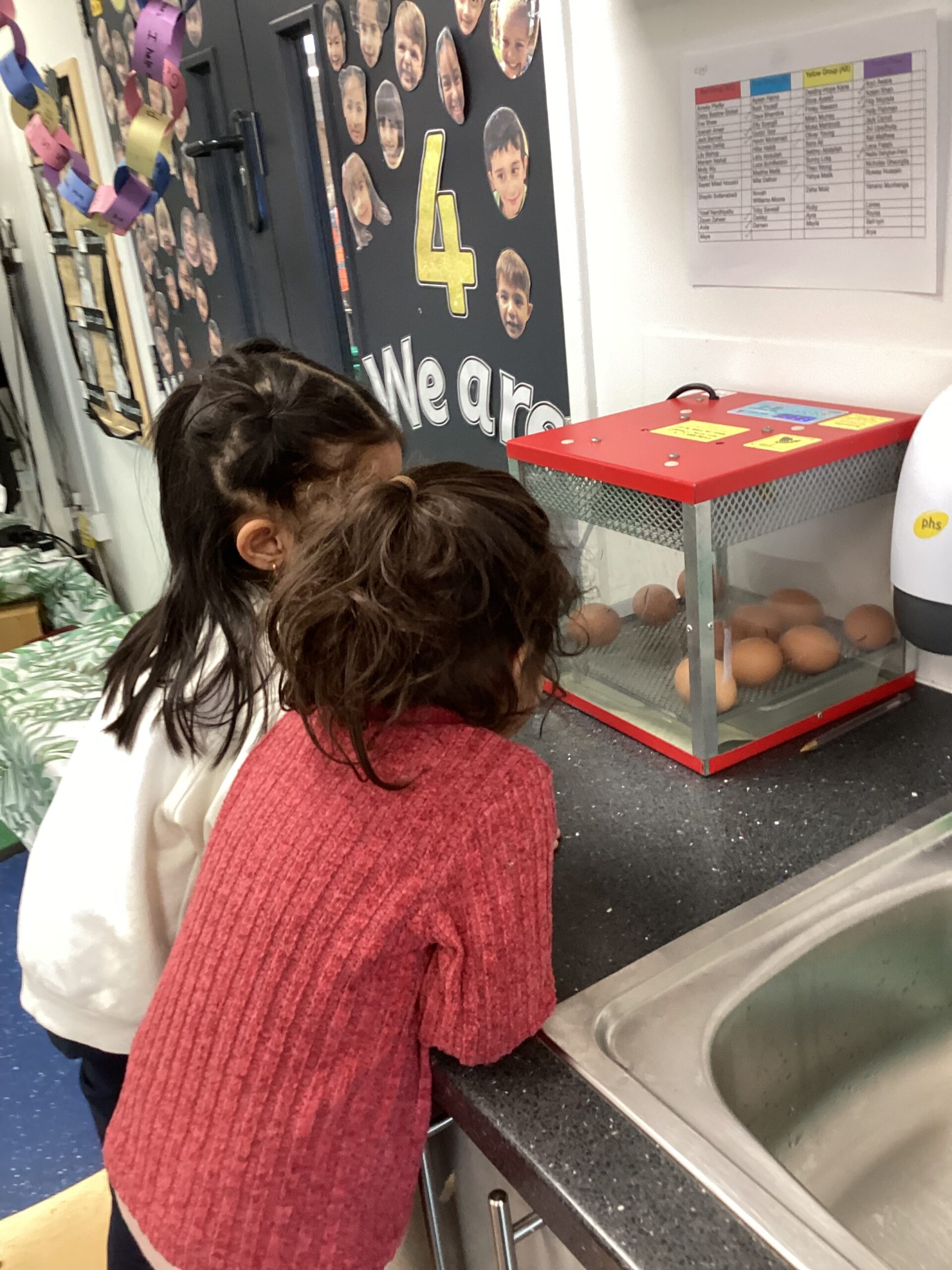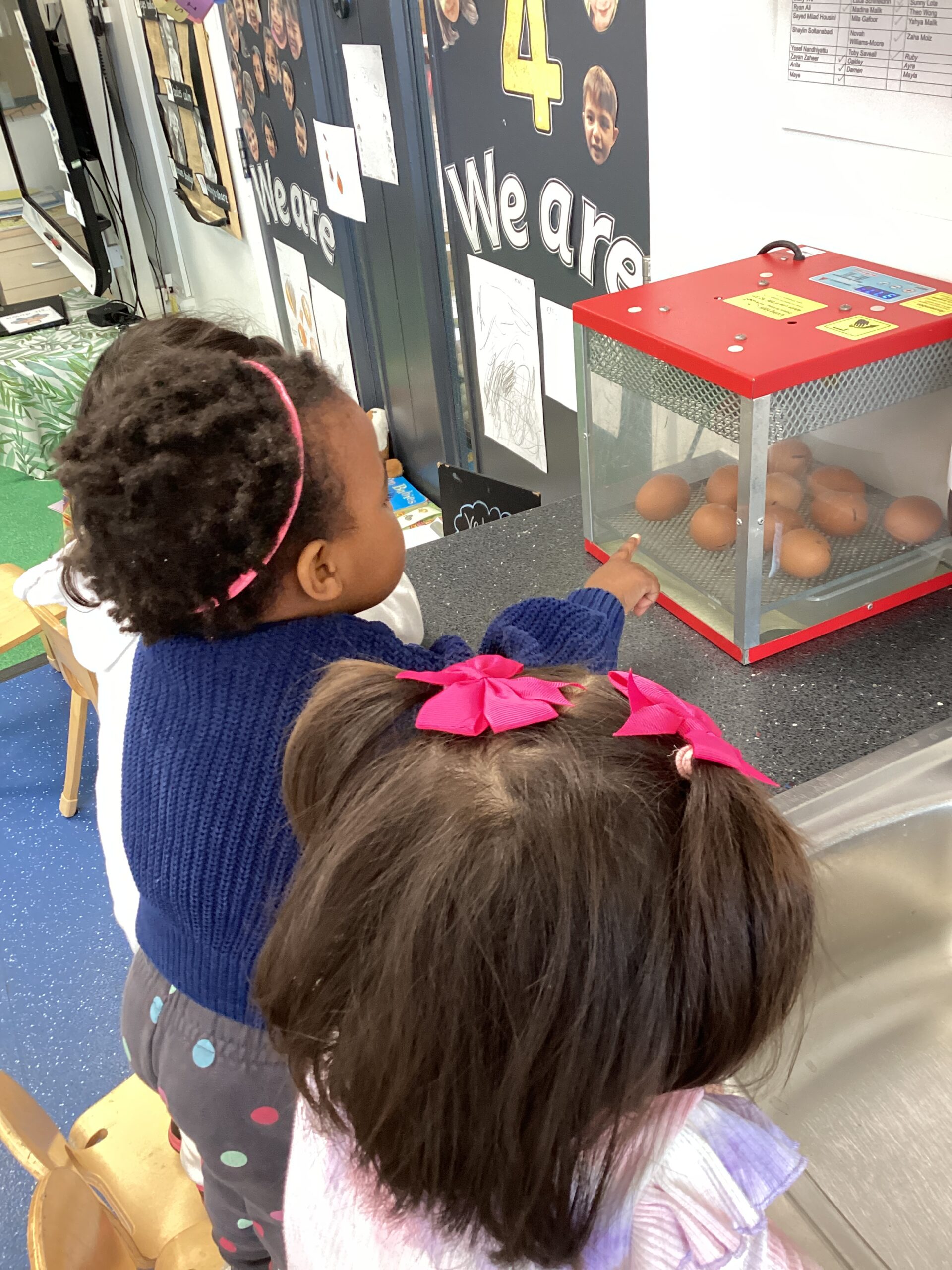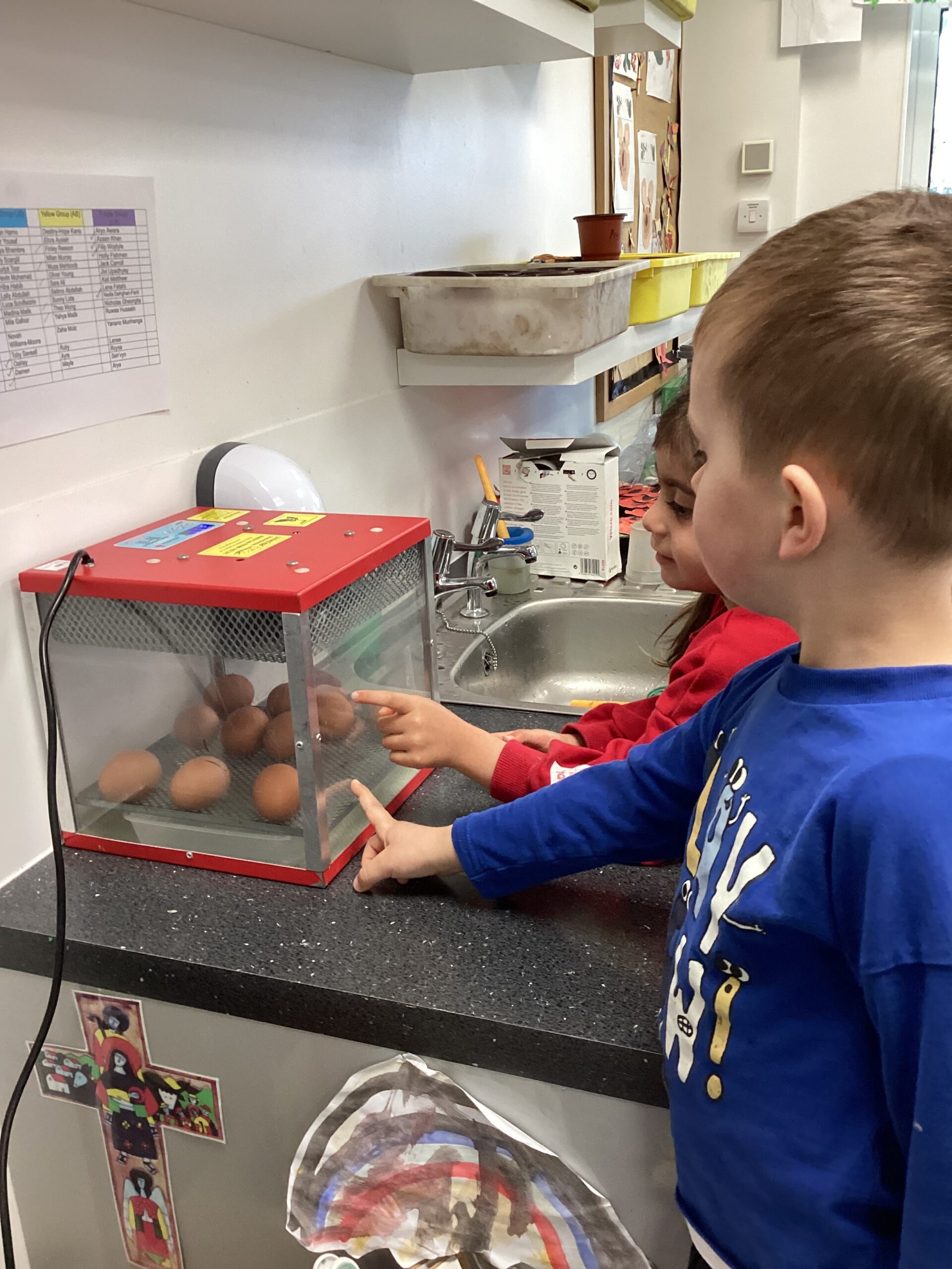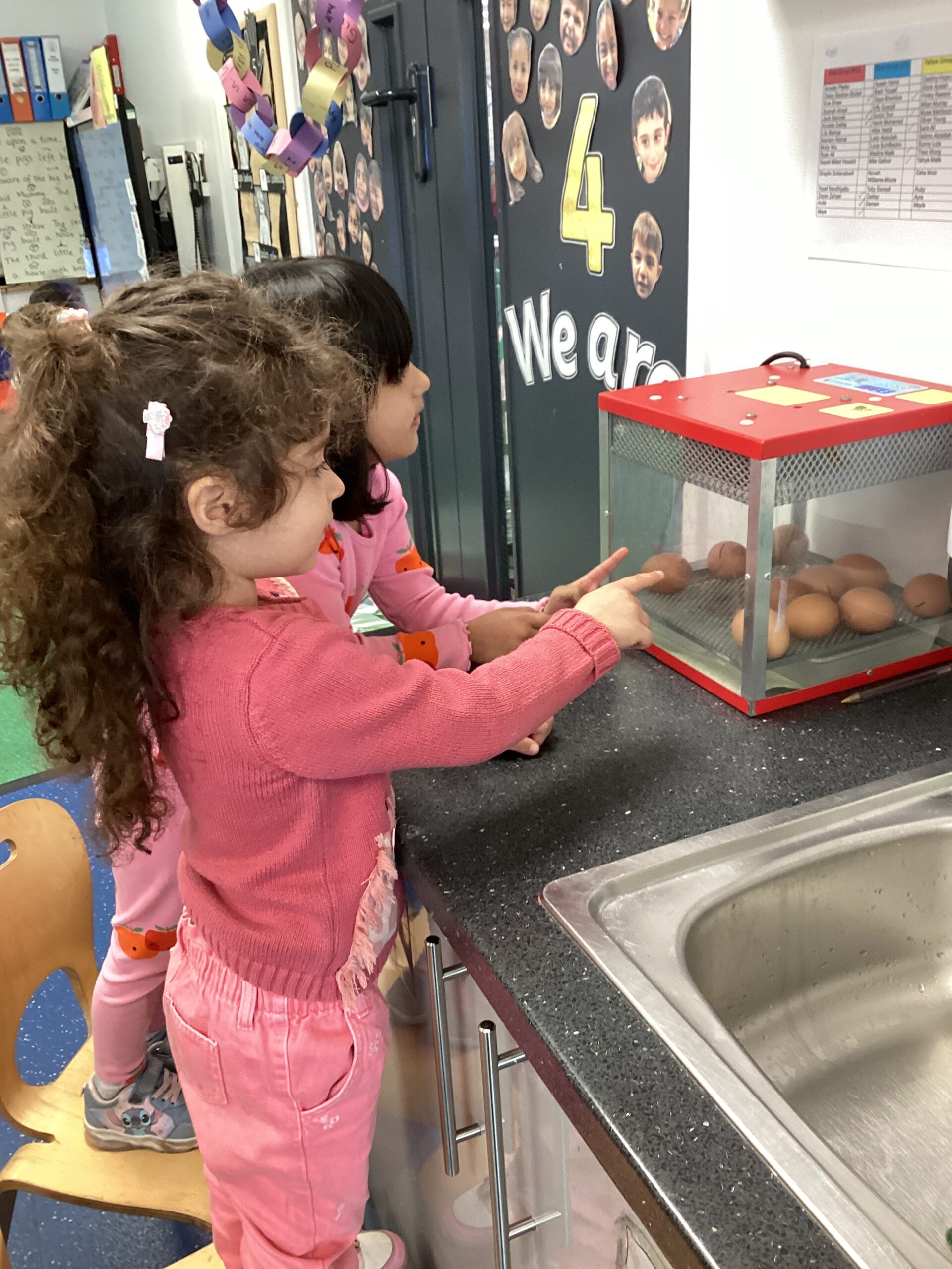 On Monday, we had a very special arrival at Nursery; our 10 eggs which were ready to hatch. We listened carefully to all of the instructions to help us care for them. We set up our eggs in a special incubator. We were told that they would hatch on Wednesday and Thursday, so knew that we would have to wait patiently. We enjoyed watching them closely and some of us had a go at some observational drawing to document the stages of our hatching project.