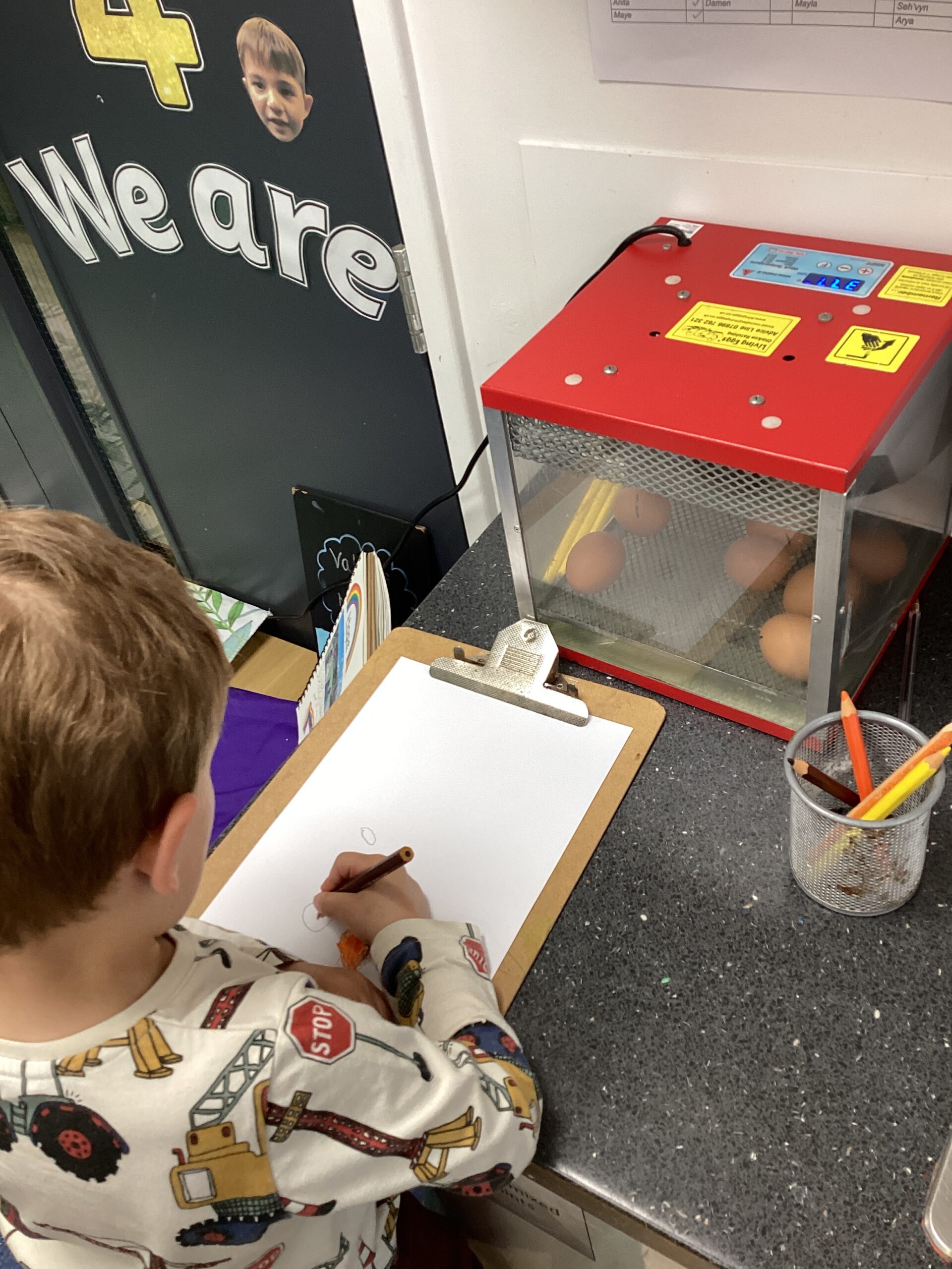 On Tuesday, we continued to wait patiently and watch closely to notice any changes. We continued to have a go at using our mark-making skills to draw the eggs, thinking carefully about lines, shapes and colours needed to make our drawings life-like! We were on countdown and told our friends that they would begin to hatch tomorrow. We all made our predictions about which egg would hatch first!