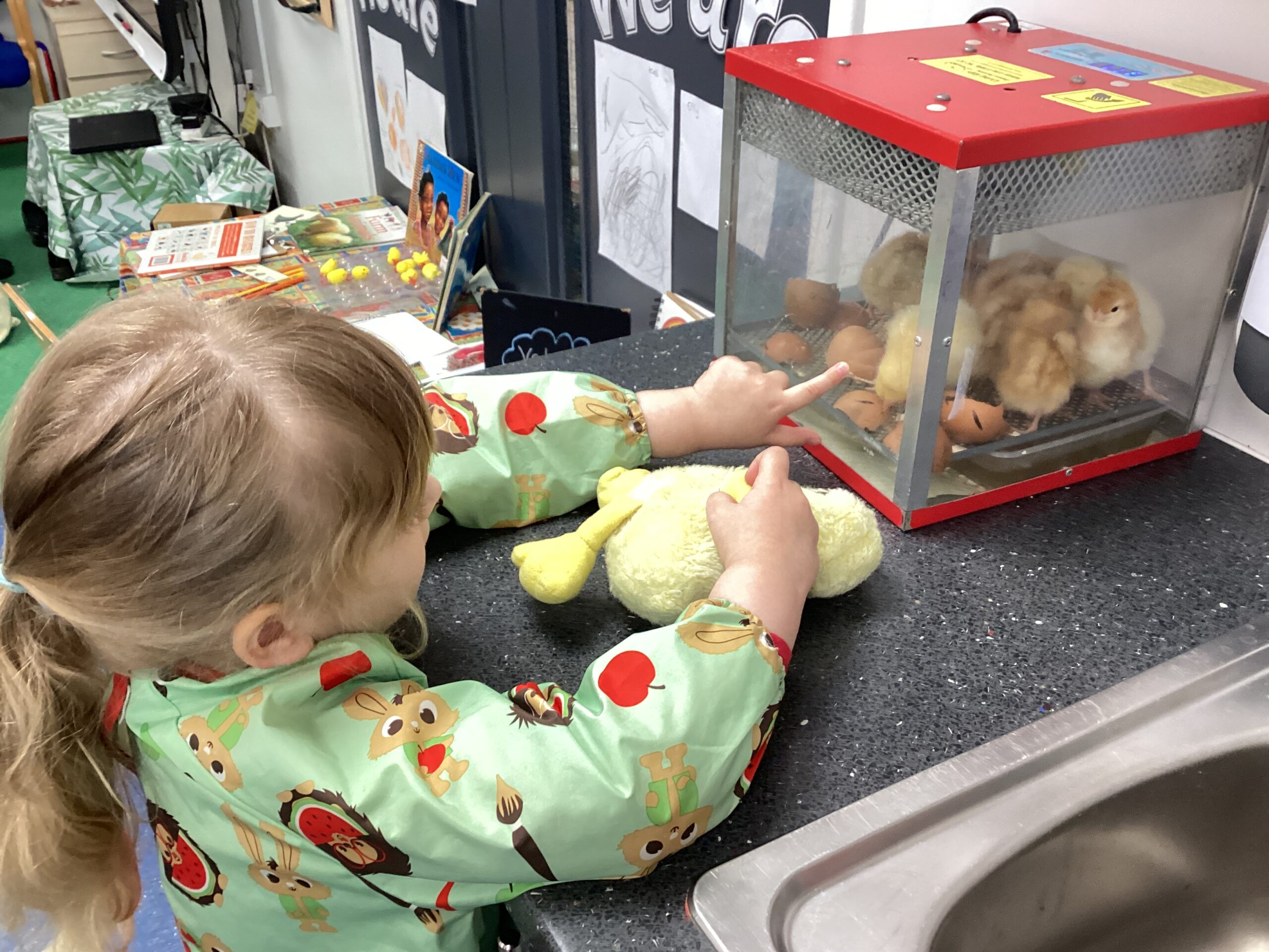 Overnight, the last two eggs hatched meaning that our 10 eggs had become 10 fluffy chicks! We all enjoyed looking at them inside the incubator. Miss Bramham told us that it was time for the chicks to move into their new home. We were incredibly helpful and kind in helping the chicks move into their new space. We made it comfortable with newspaper and sawdust. Some of us scooped food and water into their bowls. We also helped to carefully carry the chicks and put them into their new home. We will continue to enjoy them at Nursery next week, when we will be able to hold them and give them cuddles!