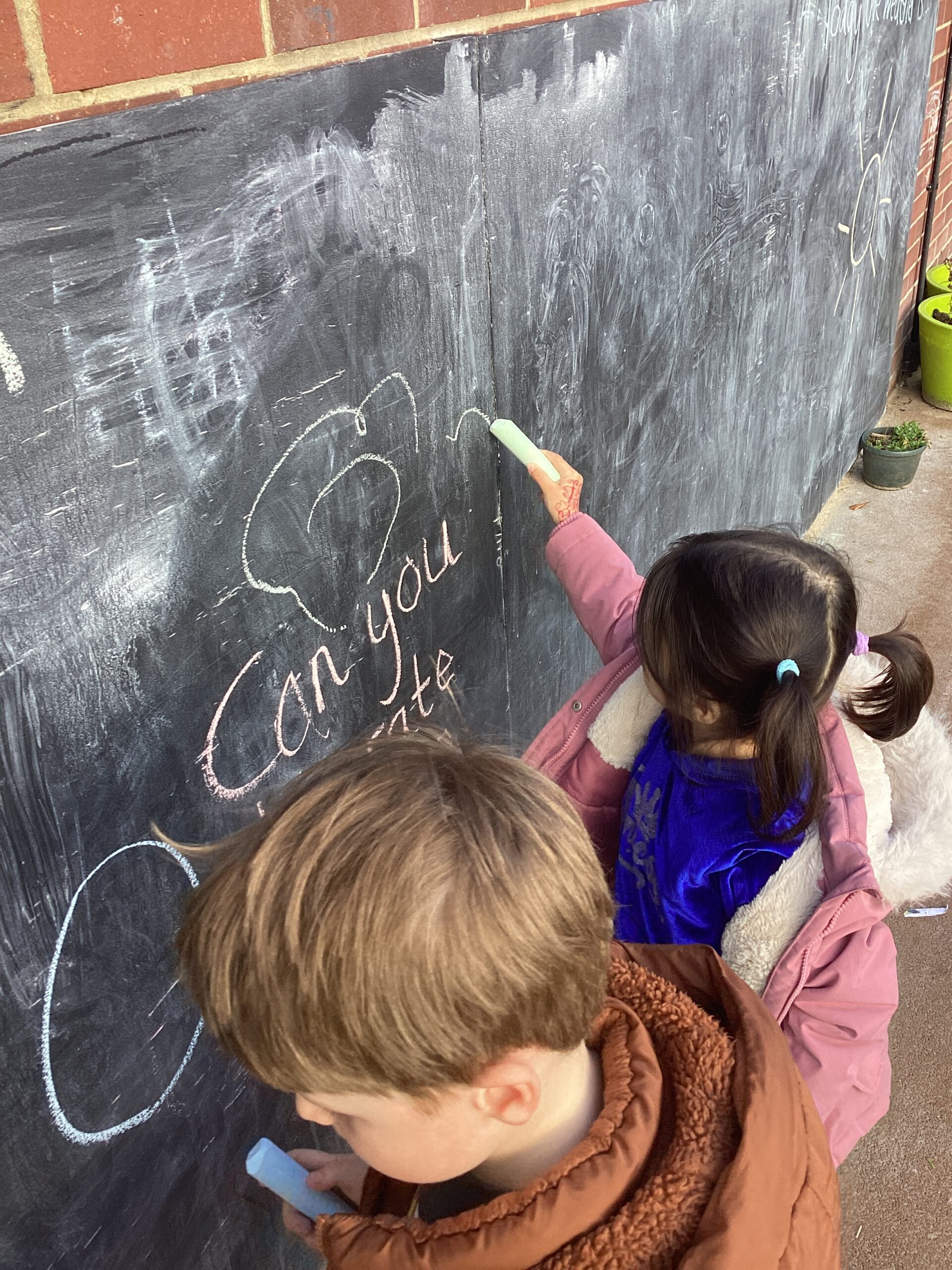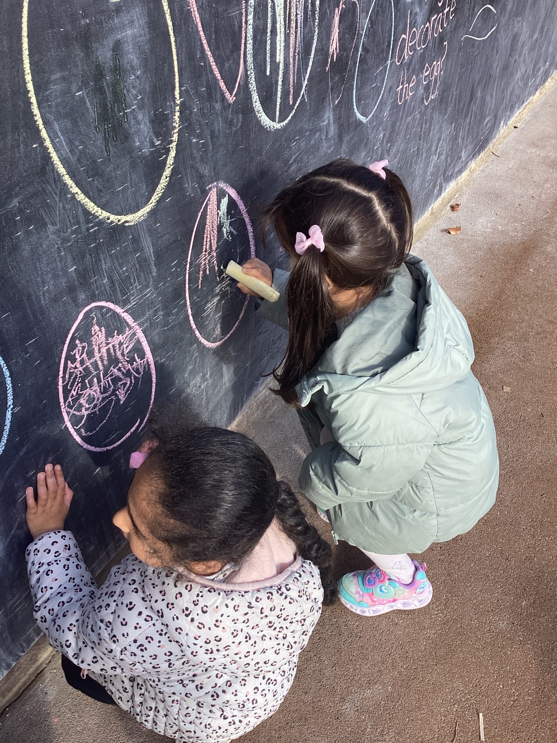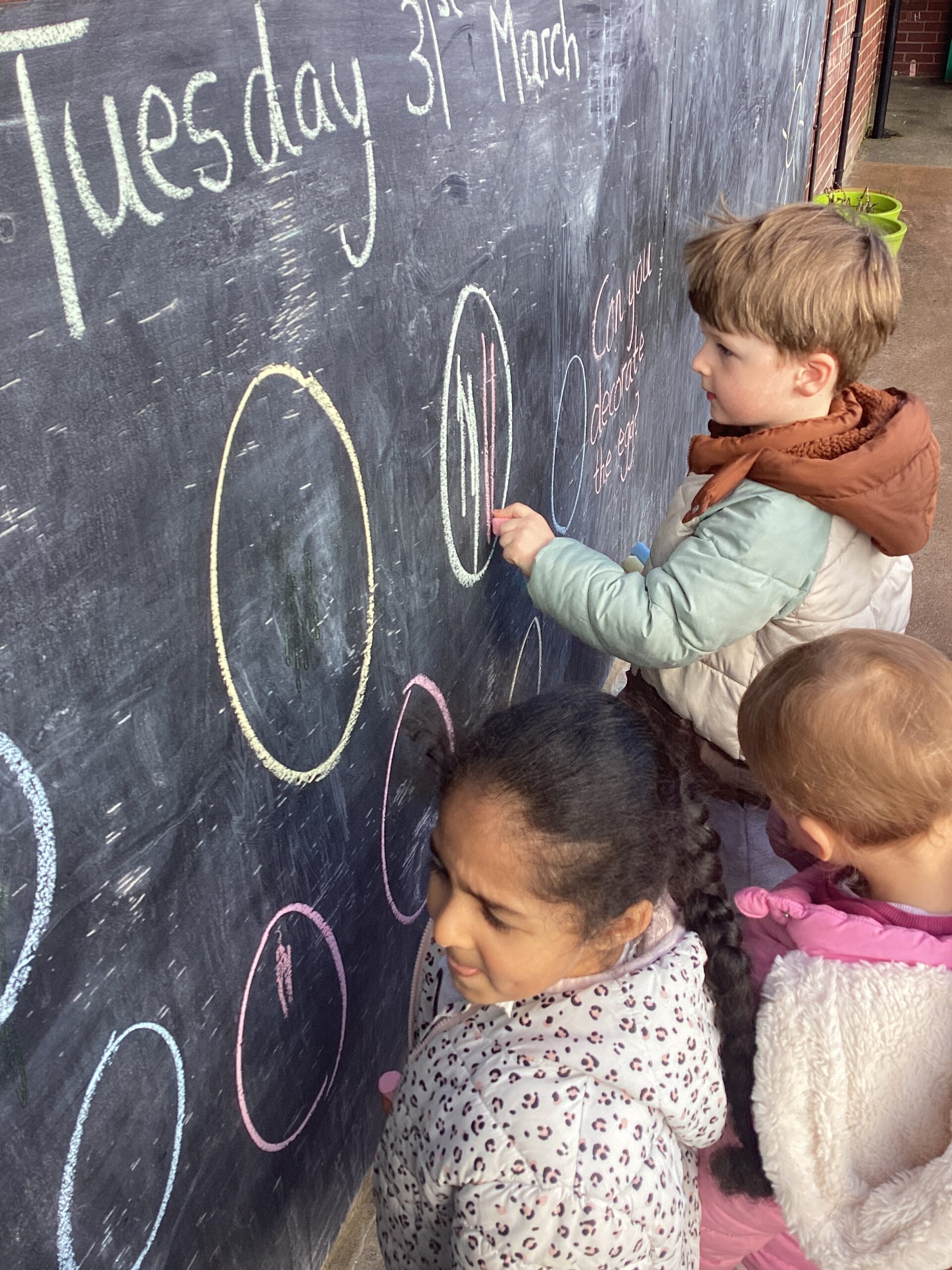 We had lots of fun outside designing our own colourful Easter eggs with chalk. We experimented with colour and pattern as we worked together, making marks on a large vertical surface to develop our gross and fine motor skills. Many of us were inspired to talk about our own experiences of finding Easter eggs and enjoying Easter chocolate at home!