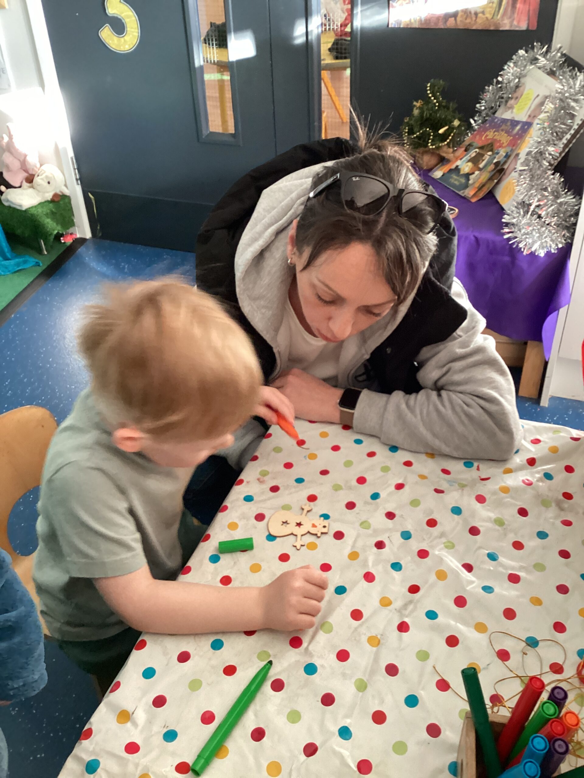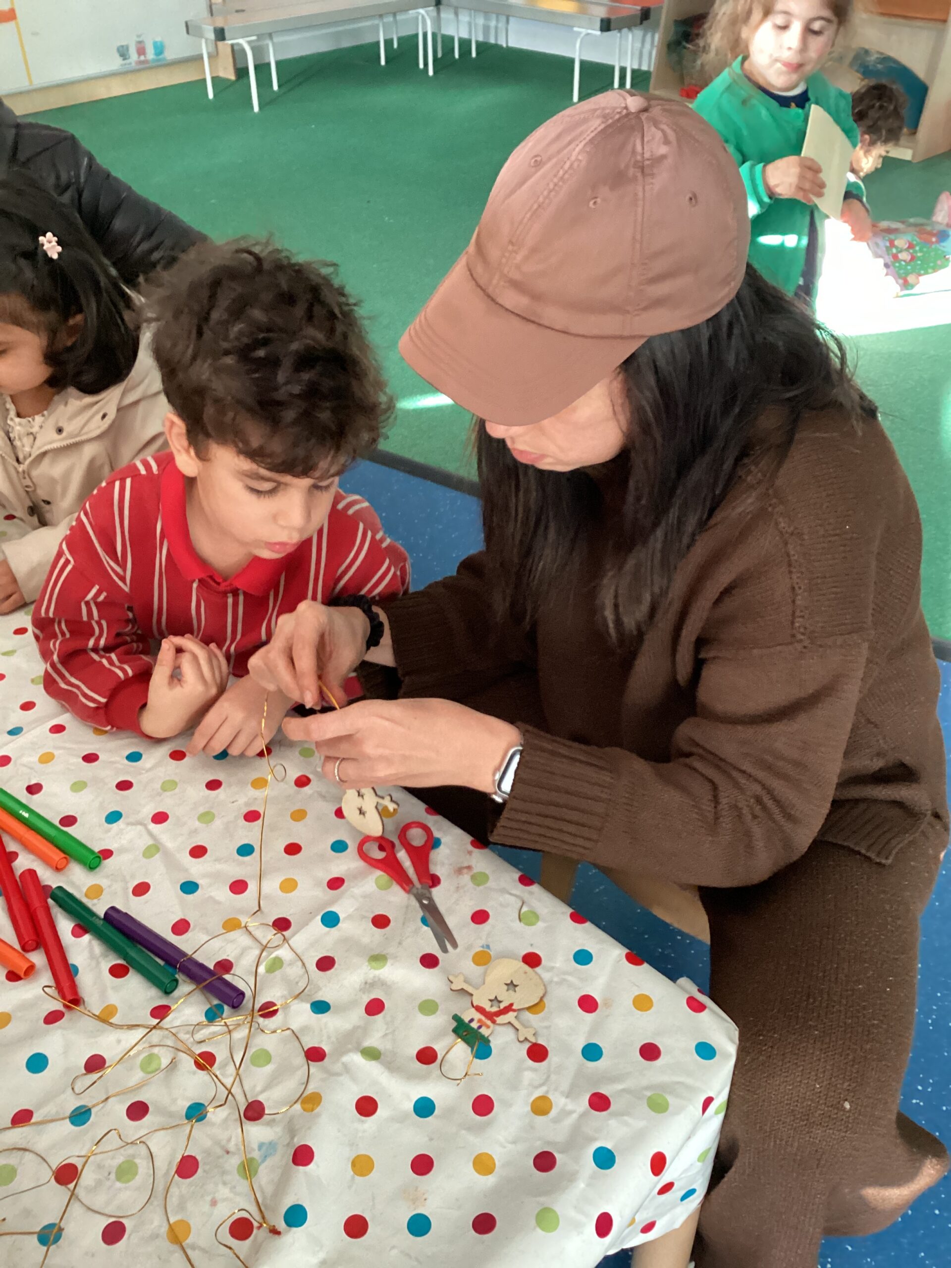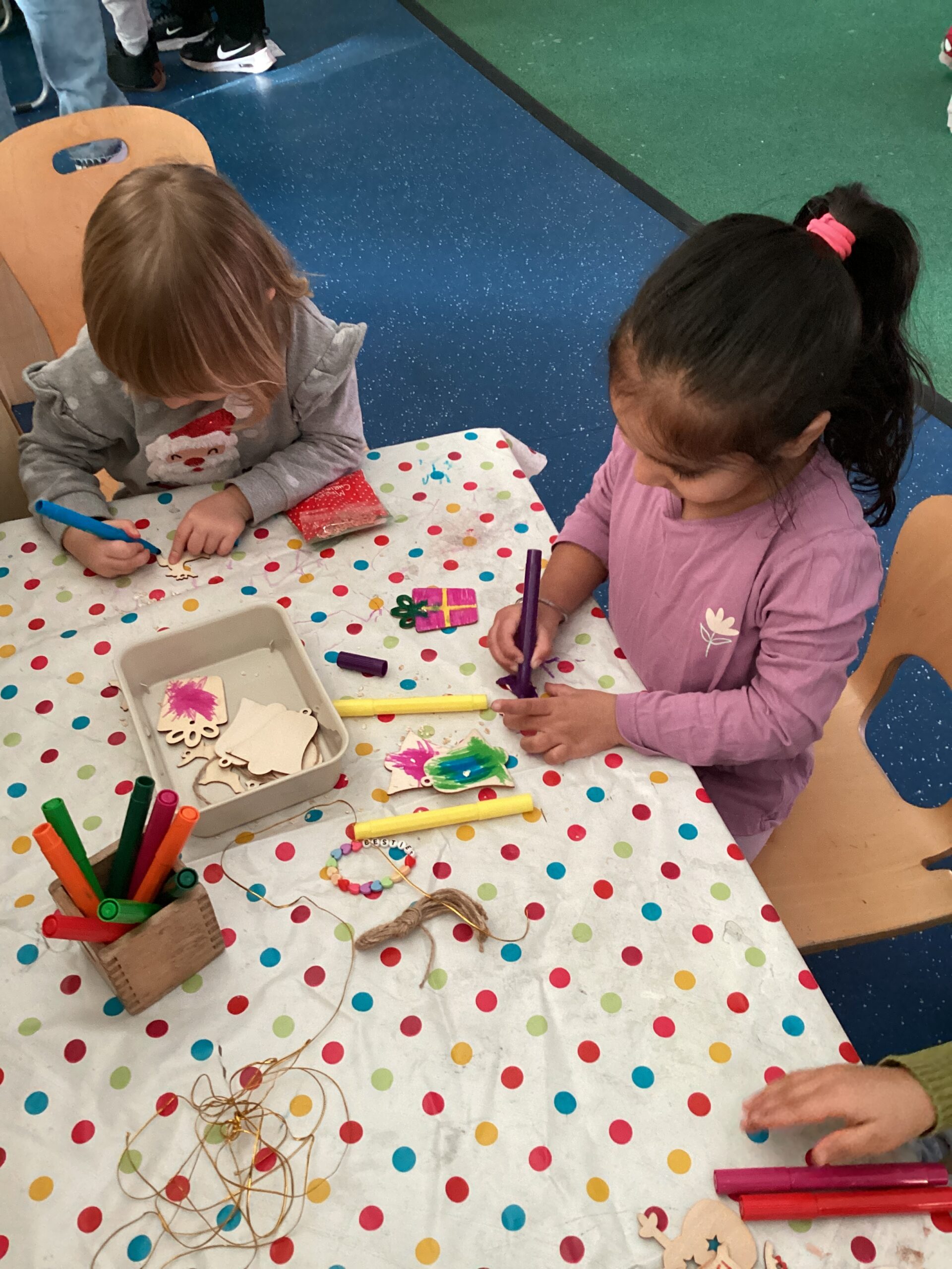 Many of us enjoyed using pens and our mark-making skills to decorate wooden tree decorations. We were very impressed with the careful control and detail added as the children brought their ideas to life. Some of us made more than one decoration to take home as gifts for our family!