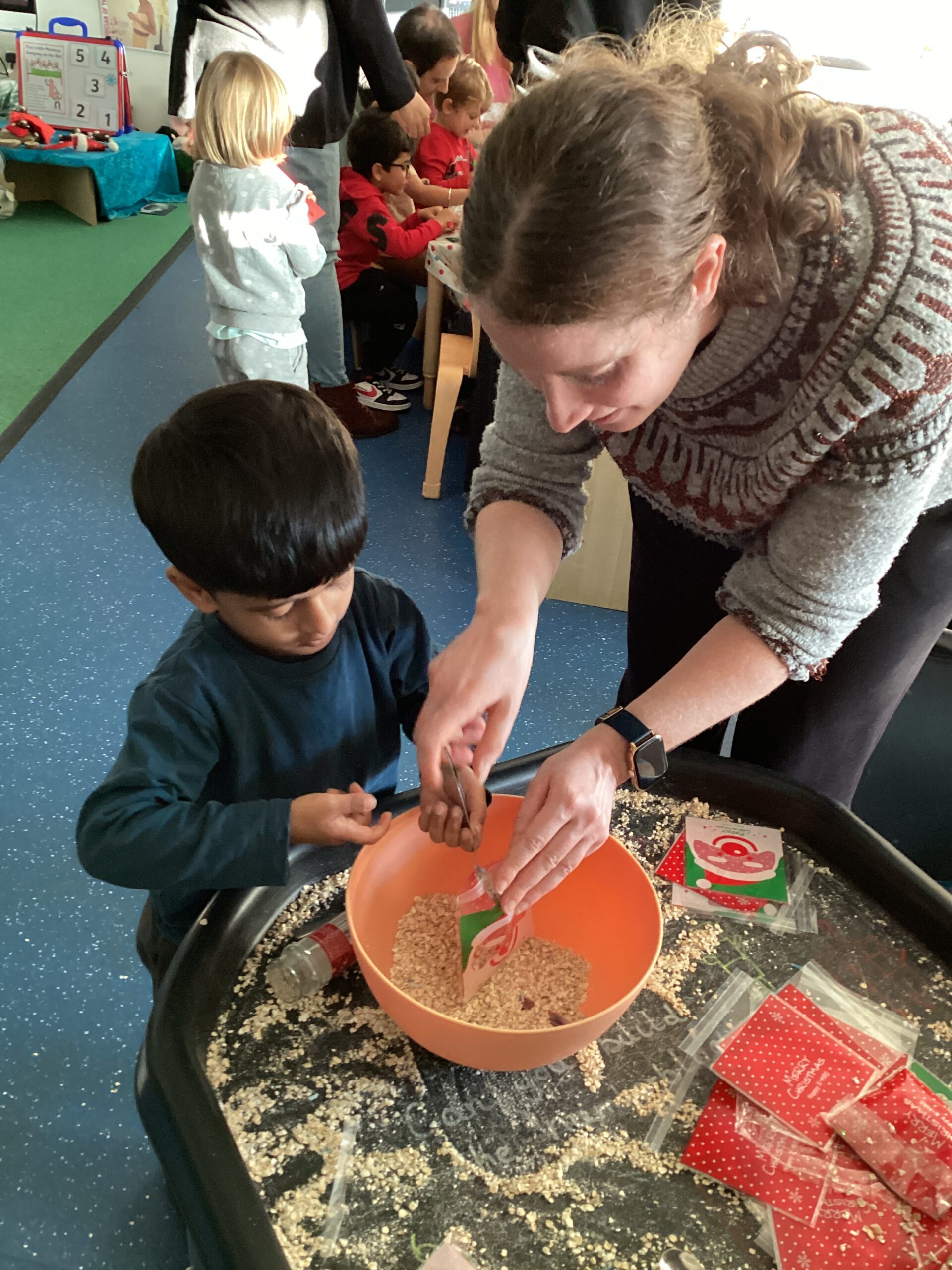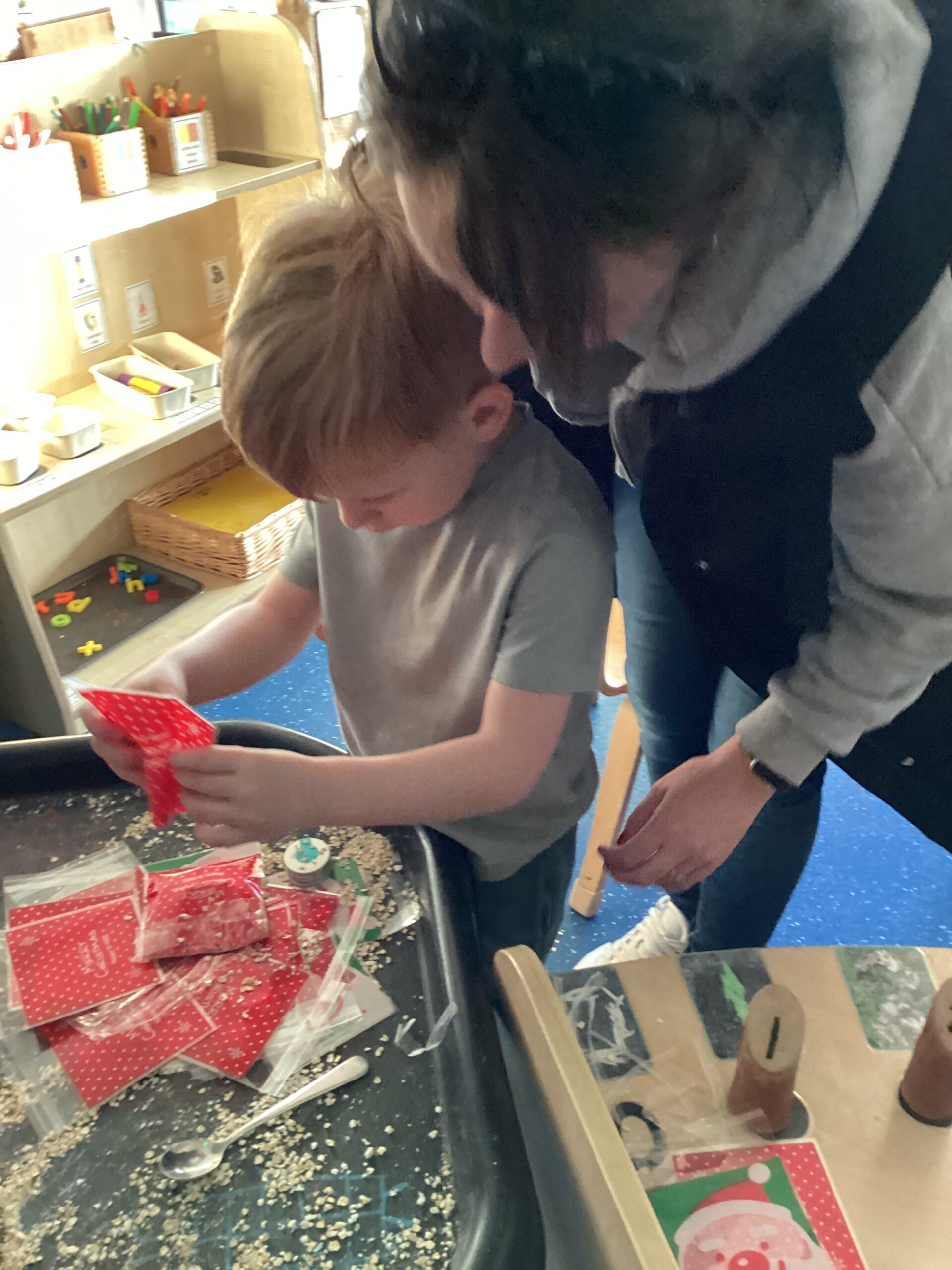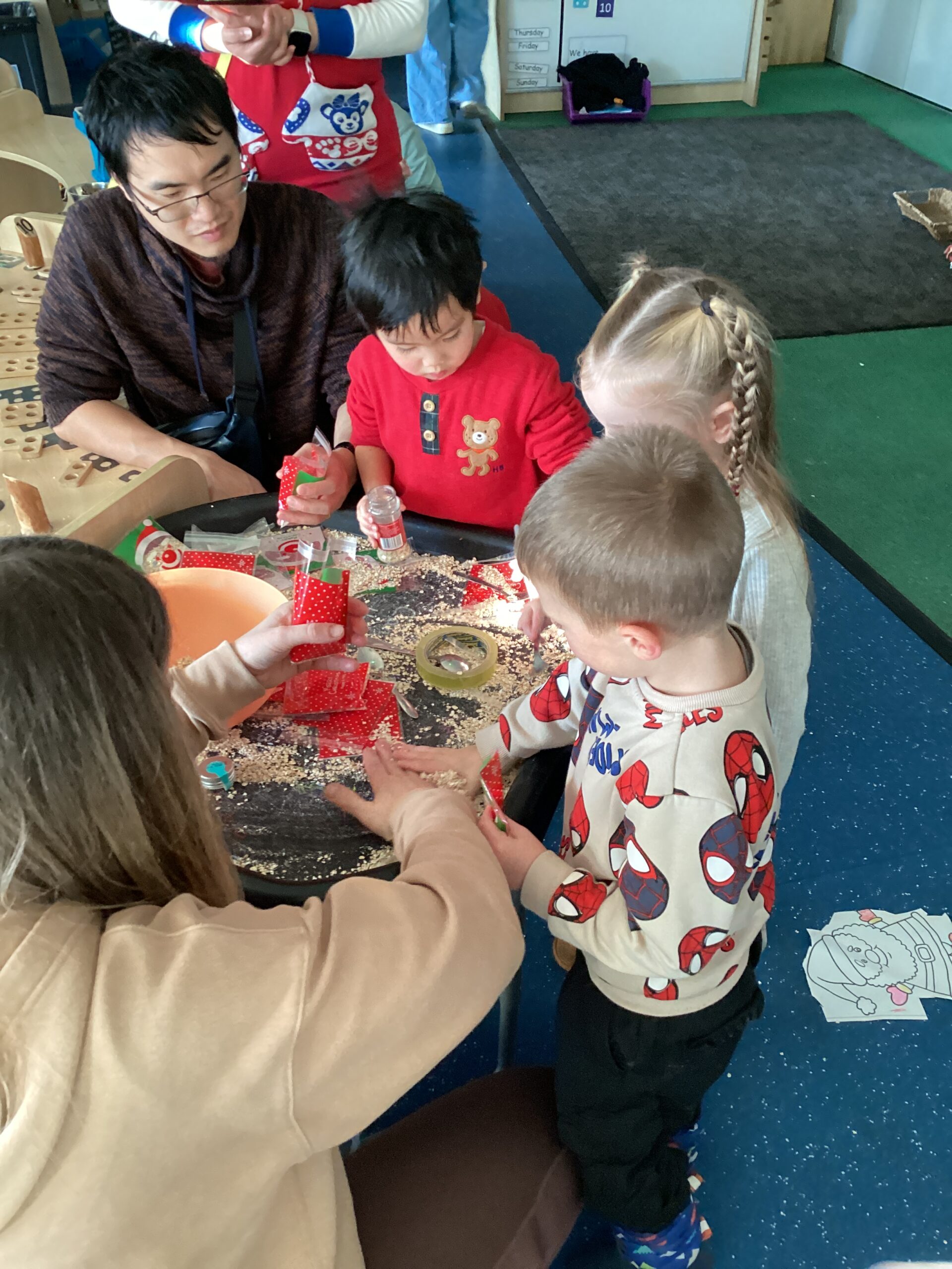 We were all keen to have a go at making a bag of reindeer food during our stay and play! We carefully scooped the mixture and poured it into our plastic bags. The reindeer food can be sprinkled outside on Christmas Eve evening for any reindeer that might be passing by. The reindeer food mix is environmentally friendly and safe for wildlife. We would love to see some photographs on Tapestry of our children sprinkling their reindeer food outside!